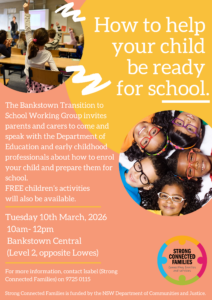 The Bankstown Transition to School Working group (part of our new, Strong Connected Families project) will be running a ‘School Readiness’ outreach where parents/carers have the opportunity to speak to workers about how to enrol their children and prepare them for school NEXT TUESDAY, 10th March 2026, 10am-12pm at Bankstown Central (Level 2, opposite Lowes).